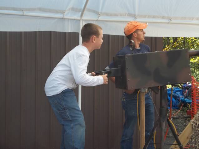Jack and Sam found the corn shooter.  That was an interesting outfit.  They each got to pick out three ears of corn to be inserted into this big gun.  Then they had to aim for a target out in the field.