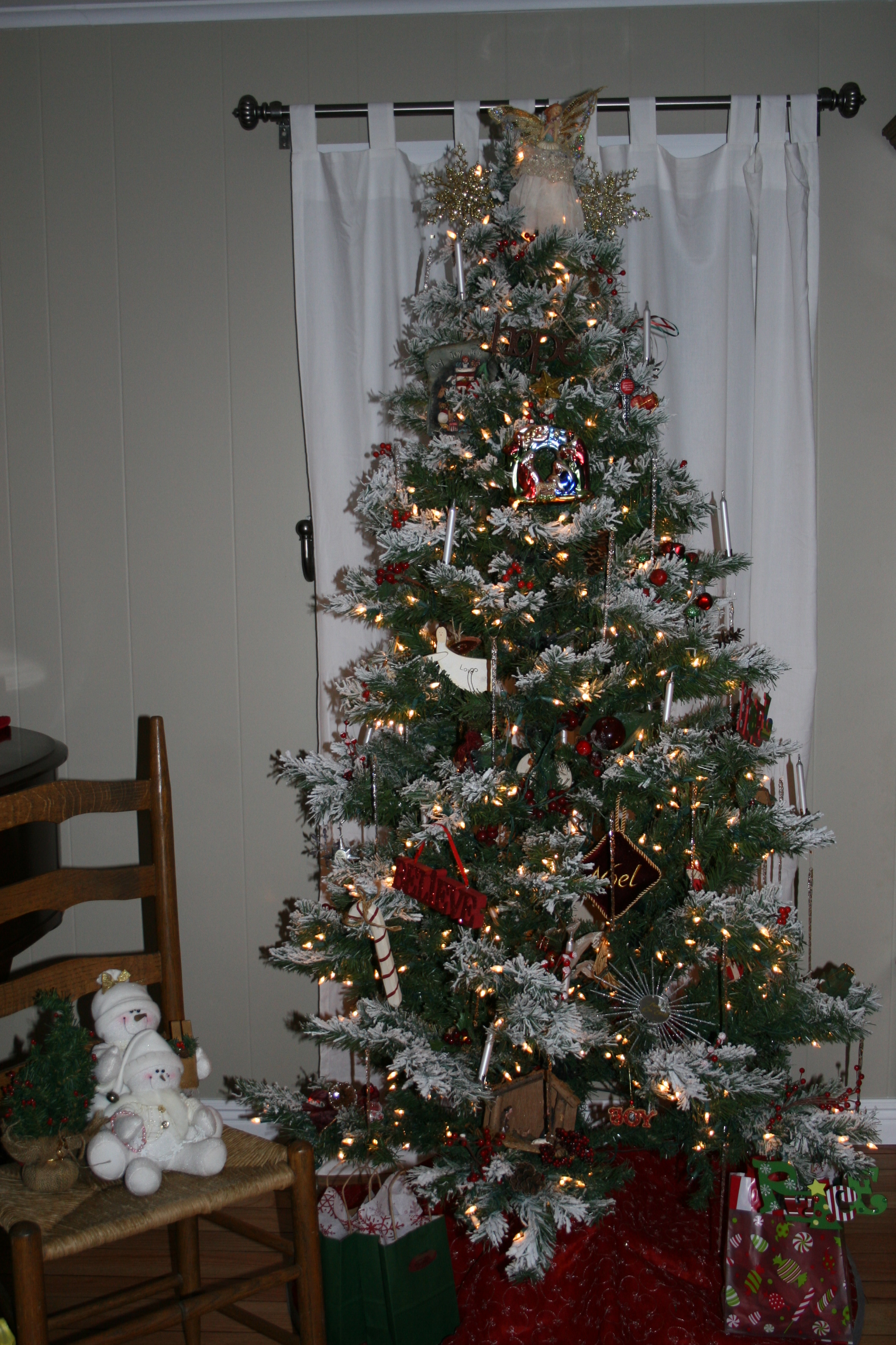 The new flocked tree was decorated with whatever was in the big plastic container I dragged in from the garage. It was pretty just with the lights and flocking.