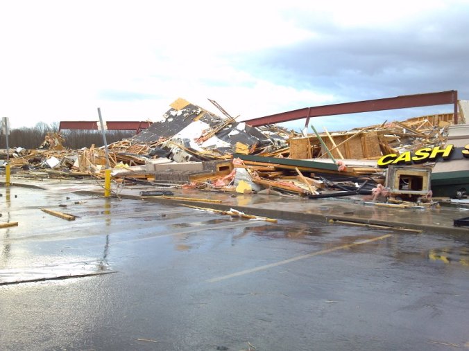 This past week two small towns in my vicinity were hit by devastating tornadoes.  One small town, Ridgway, is only ten or so miles away; the other town, Harrisburg, is twenty miles away.  Six people died in Harrisburg.  For more information about them, here is the site to one of the local tv channels:  http://www.wsiltv.com/