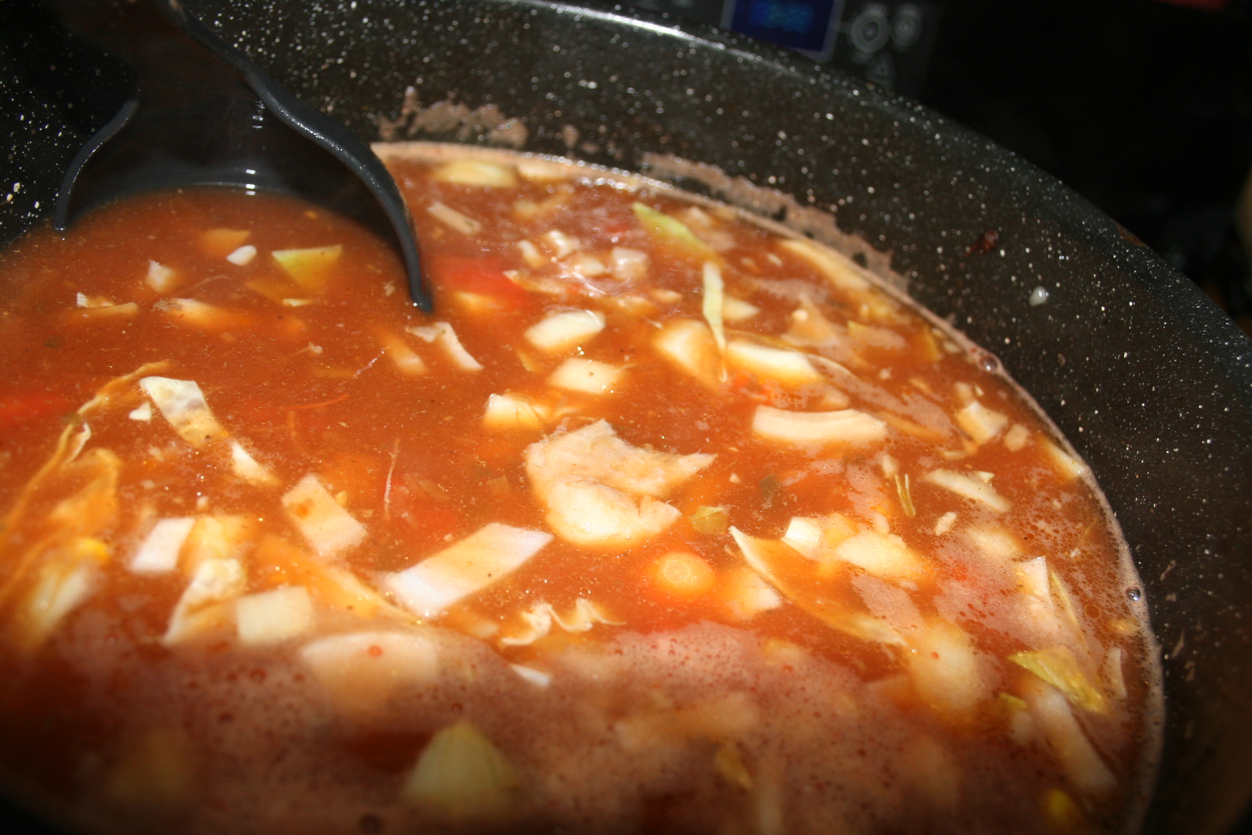 Filled with cabbage, potatoes, carrots, onions, celery, tomatoes, vegetable or tomato juice, and beef. Yuuuuuummmmm
