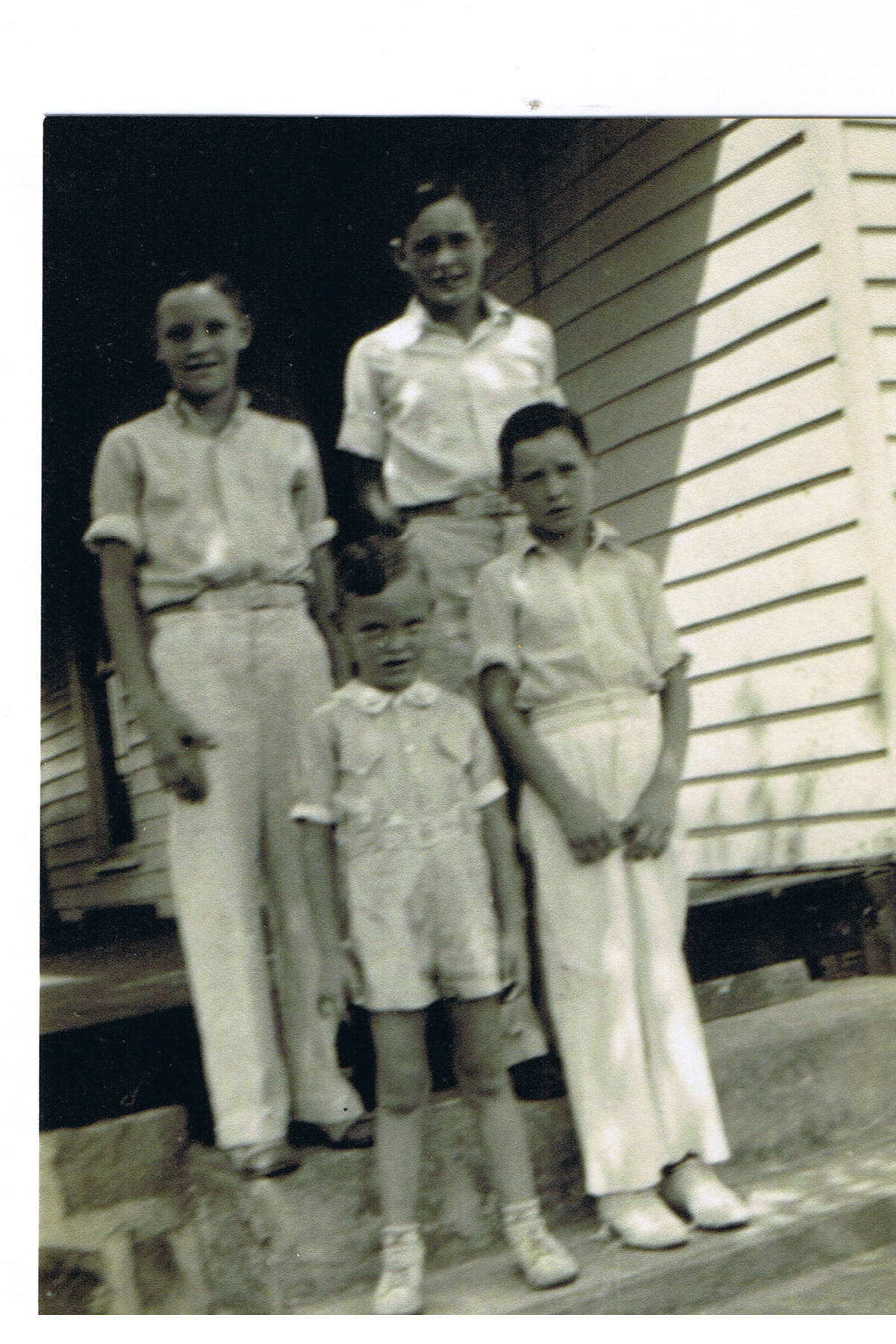 These are four brothers, my dad and his siblings. Standing on the porch of the old home place, their farm. Dad is the tallest, the oldest. The last summer of his life the three of us — me, my sister and brother — took care of him spending days at a time. We looked through old photo albums, took rides down through the country where Dad grew up, talking to first one and then another, with Dad pointing out where this one lived and that one lived. Getting all sorts of information about his youth.