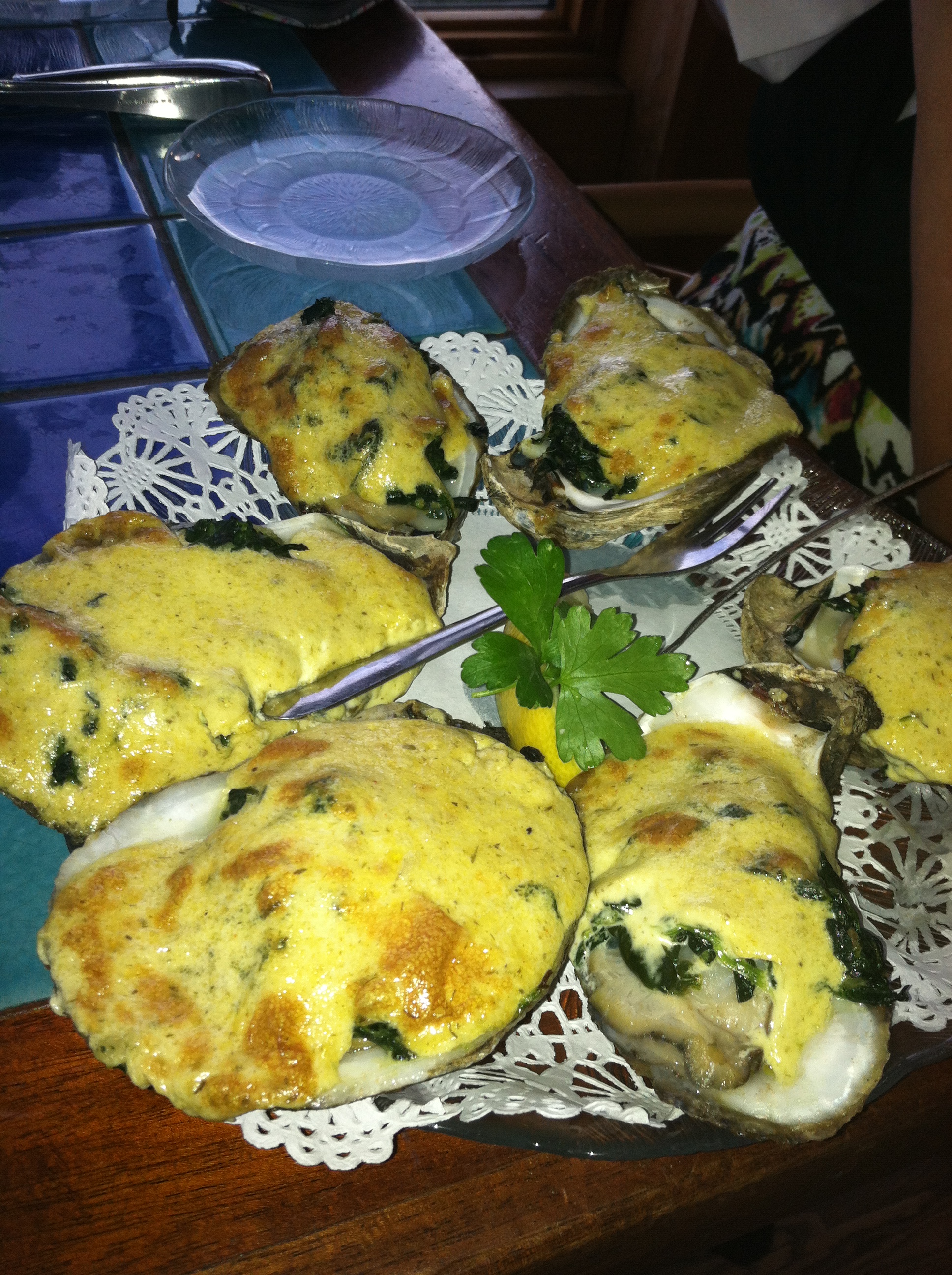 So we ordered Oysters Rockefeller. And they were pretty doggone good. As was the stuffed flounder and the most delicious chocolate mousse in an almond meringue basket… and the creme brûlée. I so love desserts.