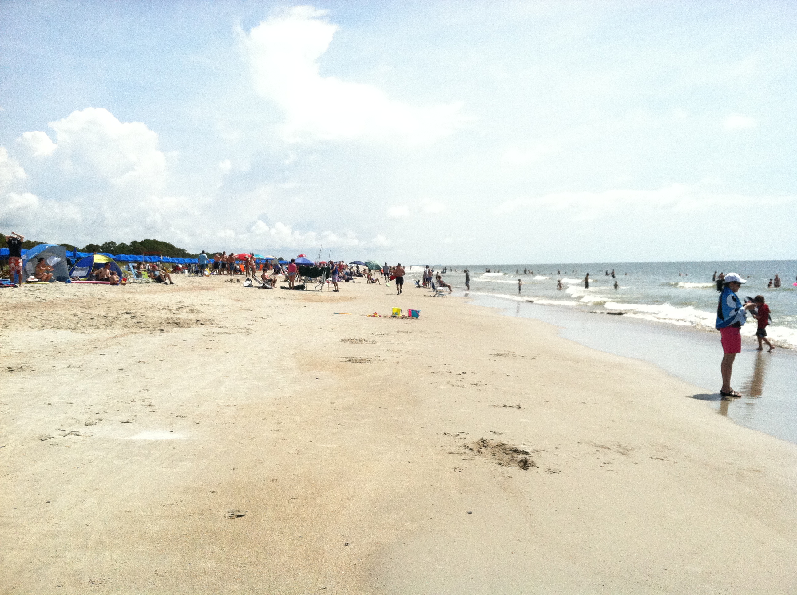 There aren’t as many people this year as last year. Still quite a few in our area of the beach, though. So the beach walk started out looking like this: people all over the place. Which. of course, is very cool. I love it! Perhaps my favorite are the dads showing their little ones the water for the first time. The little tykes hang on to their daddy’s legs as they stumble about the waves and uneven sand. I just don’t see enough of that… daddies with their children. So it gives me that warm fuzzy.