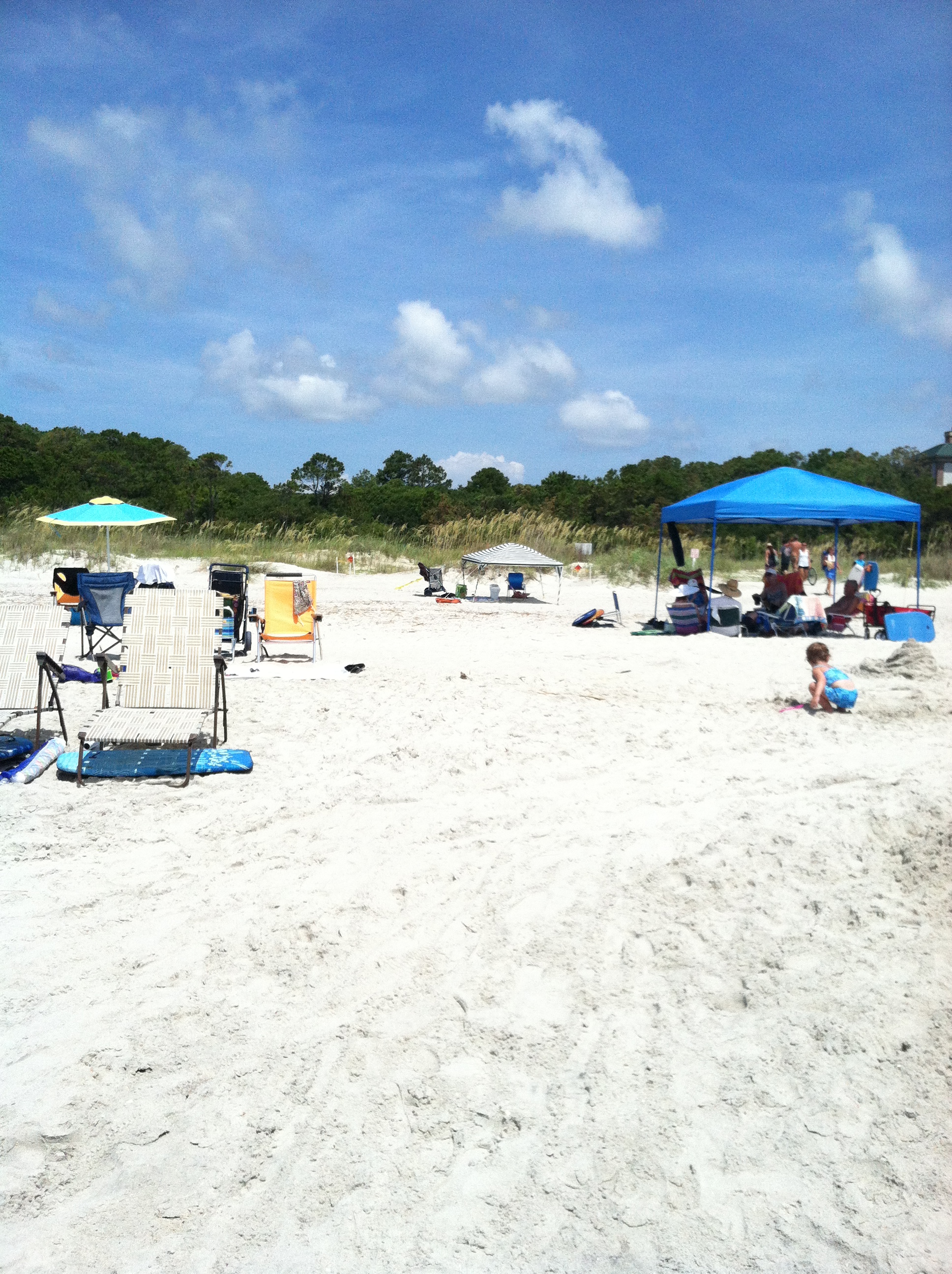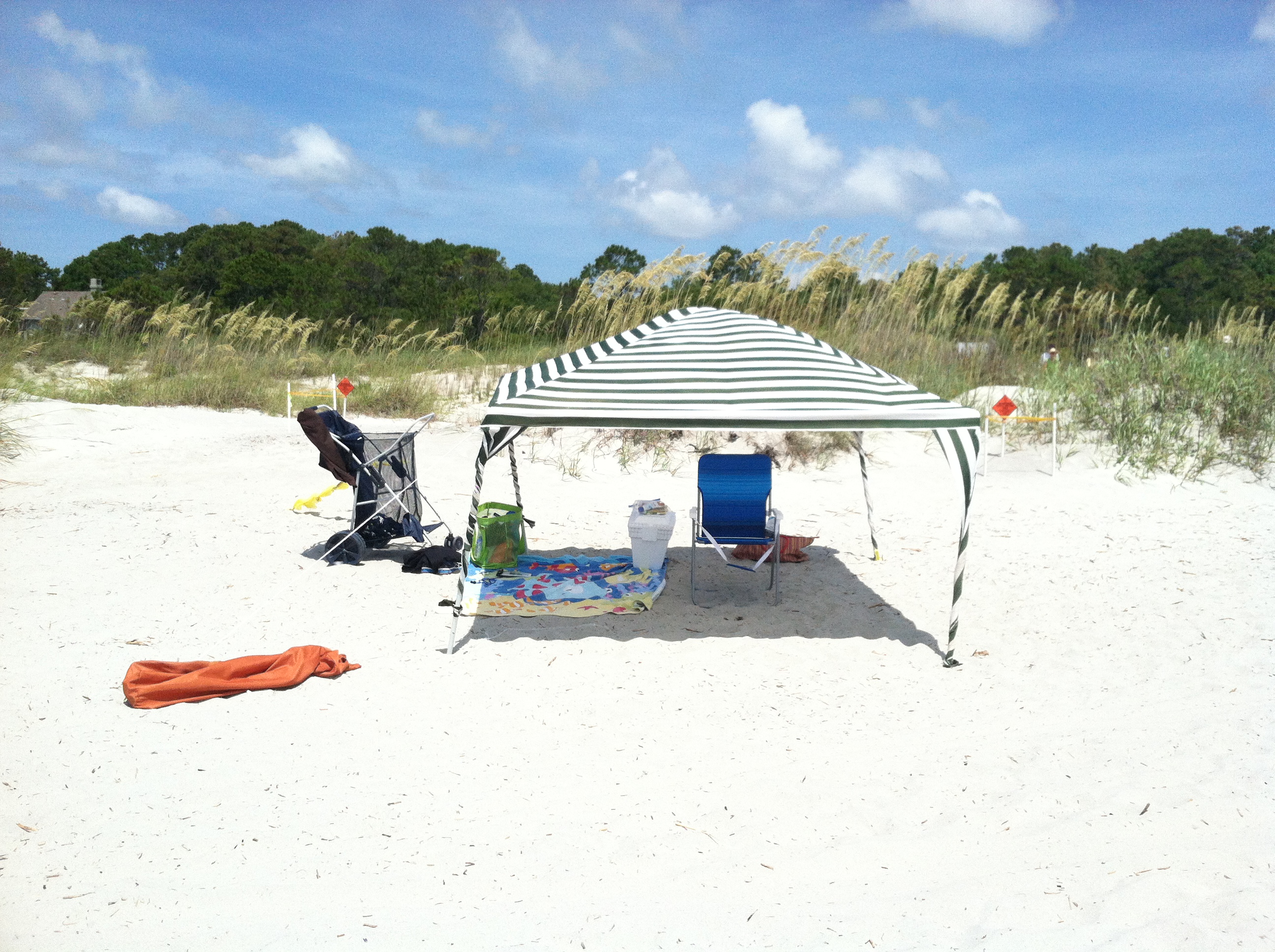 This is what our green-striped home looks like from the ocean edge. It is a mile walk. And the reason it is a mile walk is because we dump all our beach stuff as soon as we get on the beach. Not five feet from the walkway. And the reason we dump all our stuff not five feet from the walkway is because it’s heavy and cumbersome to drag through that sand even with out nifty beach stroller. You can see it sitting there beside our “home.”