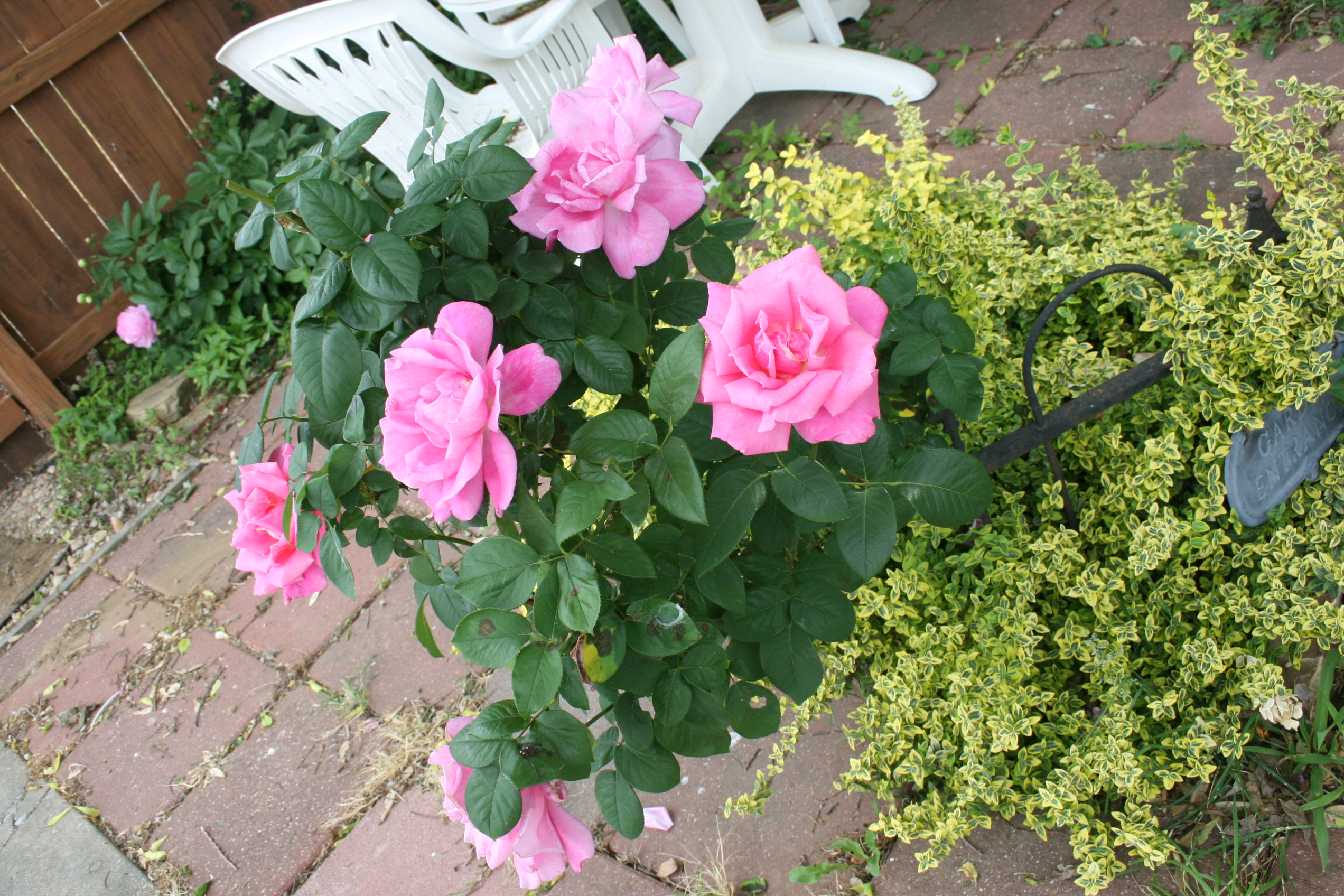 Last year it was in a pot in the backyard, but this year, after wintering in the garage, it was looking pretty ragged, so I decided it needed to go out front with the other two bushes. Only it didn’t want to go. Apparently it had become rather attached to its little pot and wanted to stay there. Every time I moved I was getting jabbed with a thorn. And not just jabbed, stabbed is more the word. Stabbed with the blade left in my arm. Hurt like the dickens!! I had to pull them out. Big, nasty thorns.
