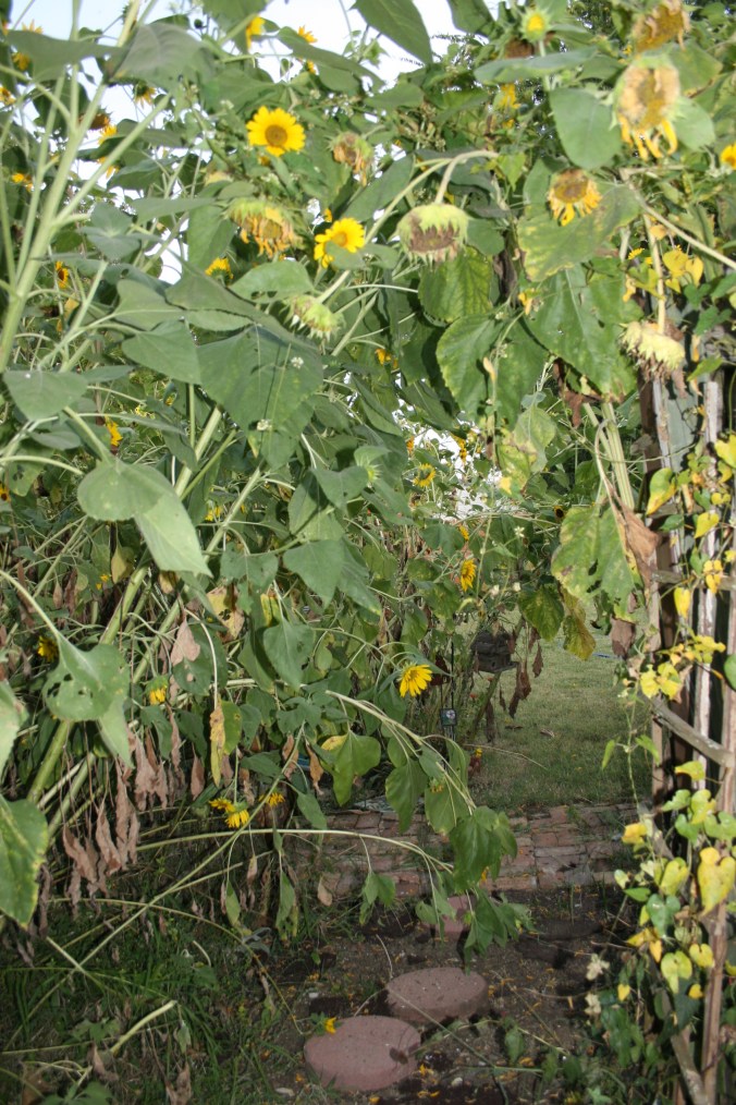 A pair of doves came by and visited a spell. They stayed quite a while and were joined by the little goldfinch. I’ve been noticing it because of its bright coloring. Just a tiny little thing that loves to sit on the sunflowers for a tasty meal. This year has been a great year for birds: barn swallows, of course; blackbirds, of course; lots of lovely cardinals, beautiful robins; hummingbirds, doves, and all these little finches. All colors of finches. I have so enjoyed watching them flit around the yard.